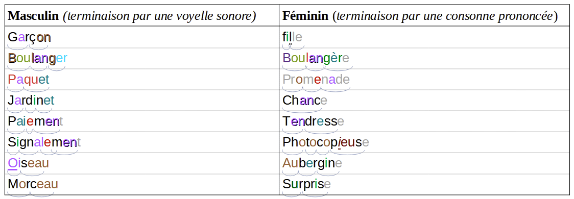 À l’écriture, nous pouvons confirmer qu’un mot qui finirait par une consonne vocale pourrait être masculin dans la condition où il n’y aurait pas de « e » en terminaison. Le « e » confirmerait le genre féminin.